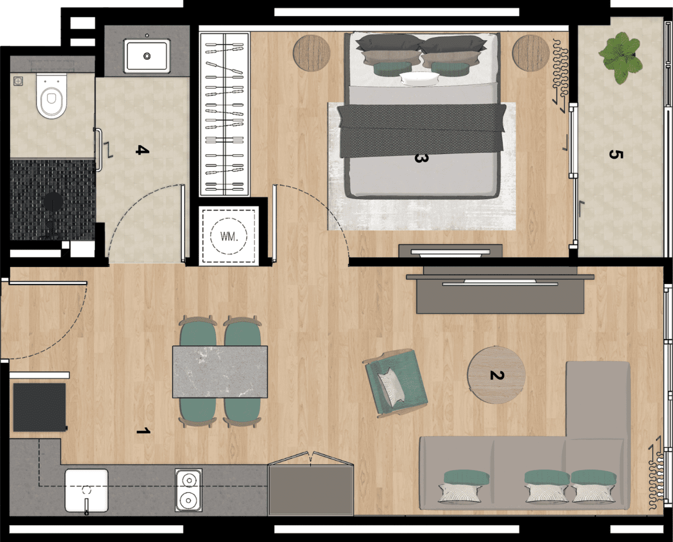 A comfortable apartment with a full-size kitchen, dining area. The living room is furnished with a comfortable sofa bed and a TV, ensuring a cozy and pleasant stay. Additionally, the separate bedroom is equipped with a storage system to keep your belongings organized and also has access to a balcony. The bathroom is equipped with a stall shower.