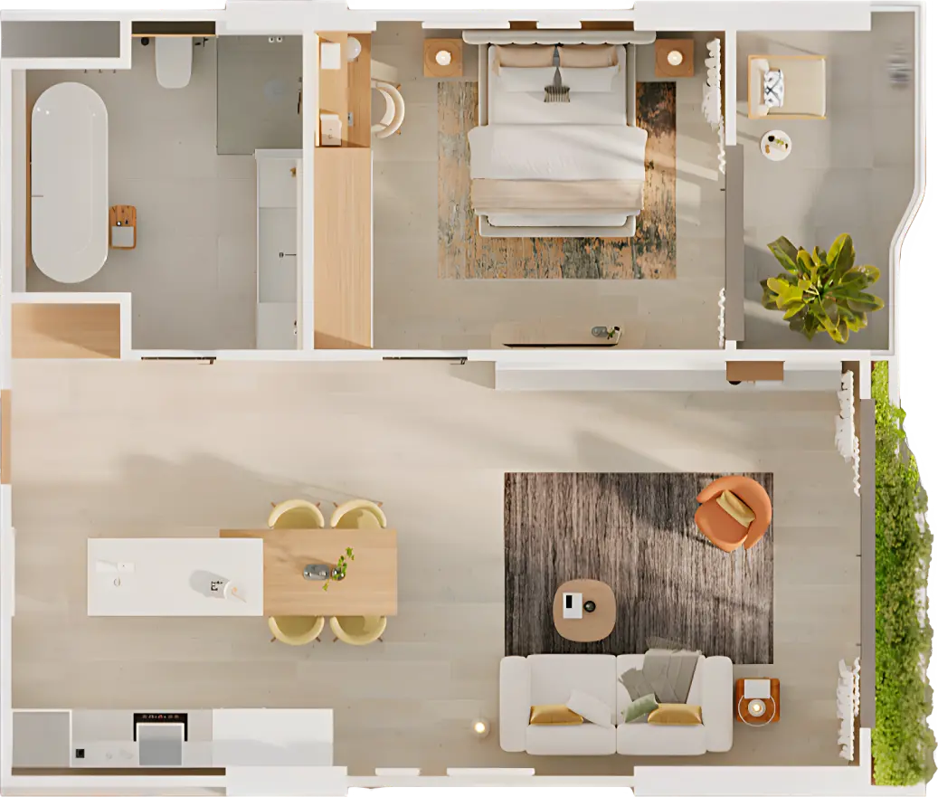 Ideal apartments for comfortable living and relaxation. The apartment features a separate bedroom with a working area and access to the balcony, as well as a spacious living room combined with a dining area and kitchen.