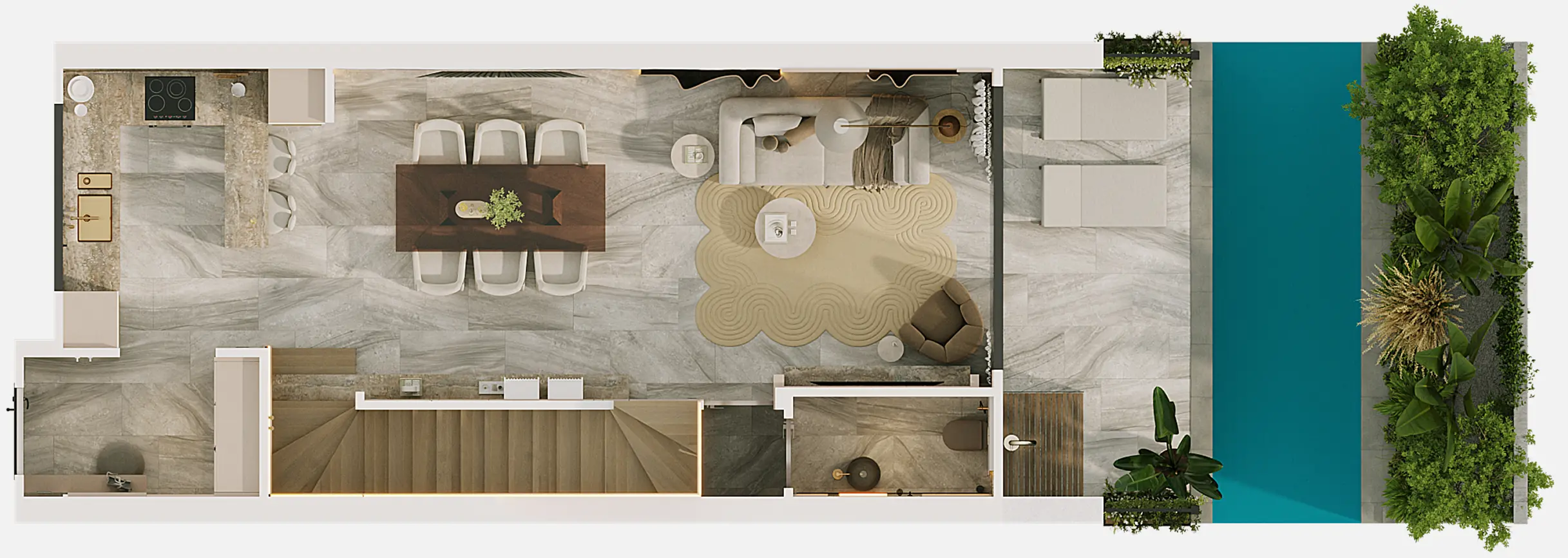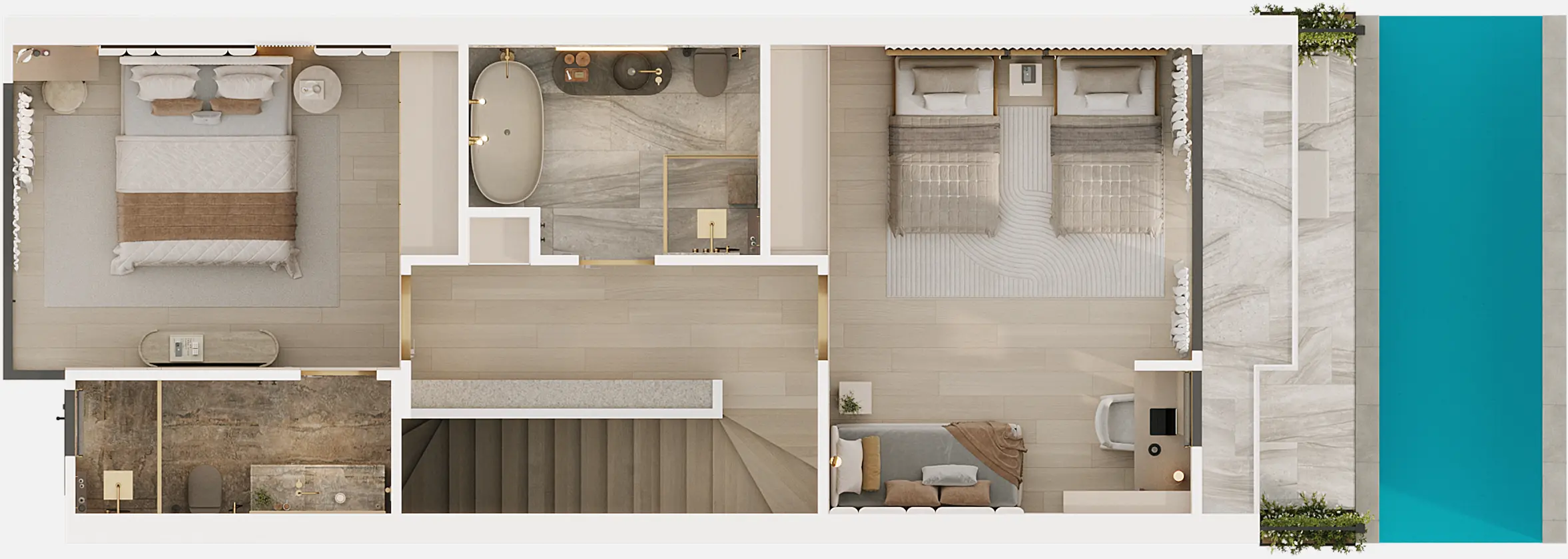 Роскошные двухэтажные апартаменты включают в себя просторную гостиную с обеденной и кухонной зонами, расположенную на первом уровне, и две уютные спальни с санузлами на втором уровне. Наличие личной террасы позволит наслаждаться уединением и отличным отдыхом.