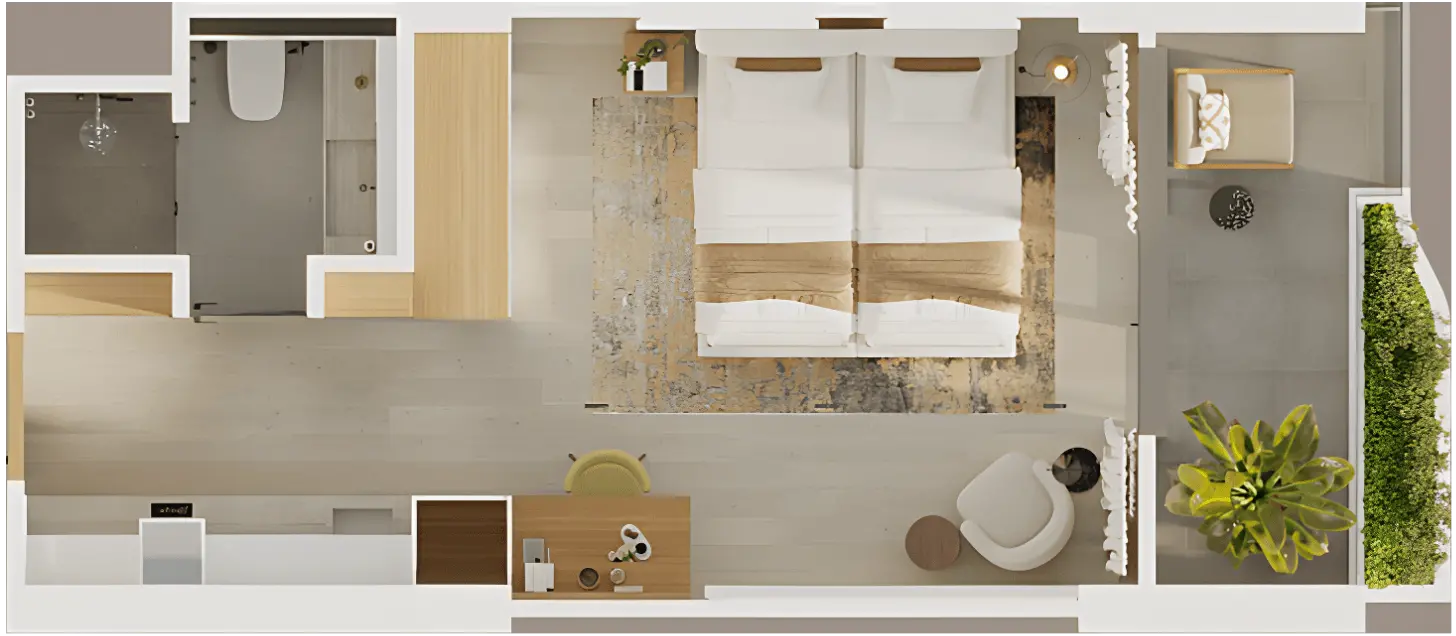 Квартира-студия имеет продуманную планировку и включает в себя полноценную спальную зону, санузел и укомплектованную кухню. Пространство организовано максимально функционально, а благодаря панорамным окнам помещение наполнено светом.